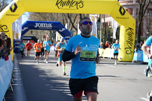 Los ritmos constantes los mantuve en el camino de vuelta, la bajada desde Plaza Castilla hacia el Retiro. A pesar de poder apretar un poco más en las bajadas, no quería forzar. La recta hacia meta una fiesta. Se confirmó el record personal, dejando la marca en 1h31’08». La sensación de que apurando se podía haber bajado de 1h30′. La alegría de no dejarse llevar por los impulsos y mantenerse firmes en el principio de seguir las pulsaciones y no dejarse llevar por tiempo. Al final es mi forma de no forzar la maquinaria más de lo que se puede. Además, teniendo en cuenta que el sábado, no fue un día de descanso, si no de rodillo 3 horas de series, siguiendo con los entrenamientos … la marca sabe todavía más dulce.