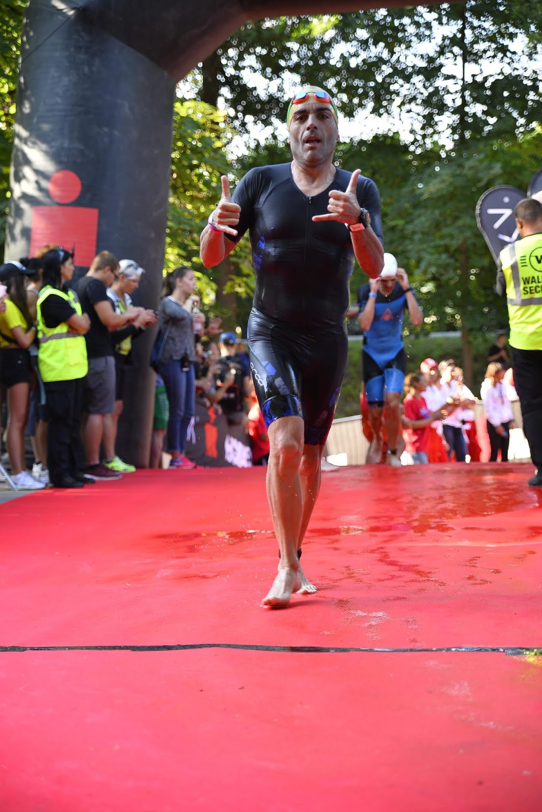 La carrera espectacular. Lo dicho nunca se sabe si es porque has regulado en la bici, porque has medio «descansado» en las transiciones. El caso es que hice mi segunda mejor marca histórica en un maratón. Teniendo en cuenta que es el maratón de un Ironman es increíble. Hice 3h18′, quedándome a 6 minutos por detrás de mi mejor marca personal, hecha el año pasado en Berlin. Aquí ningún pero, ninguna pega. Muy cómodo desde que comencé a correr a pesar de que se puso a diluviar, con un viento hiper agresivo. De hecho tiró varias vayas de protección y luego me comentaron que pudieron suspender la prueba si no hubiese amainado el viento 5 minutos después. Lo pienso y si hubiesen suspendido la prueba en mi mejor sector, en mi sector espectacular, el que se quedará en mi memoria toda mi vida … uffff de la que me he librado.
